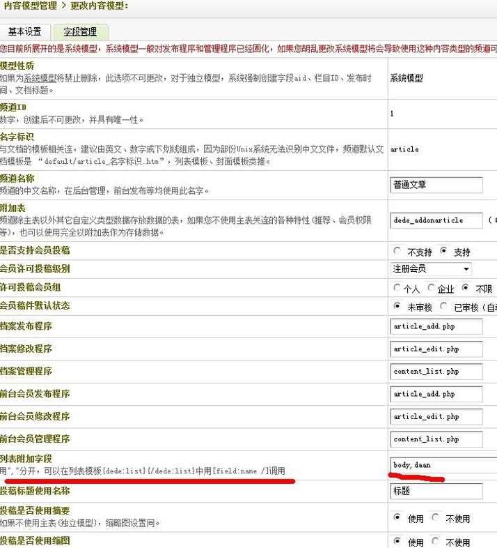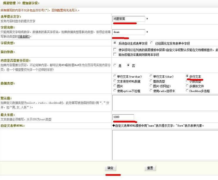以普通文章频道中新建字段为例:添加“问题答案”字段名称 "daan"点击核心-频道模型-内容模型管理-普通文章