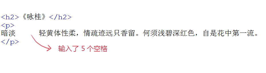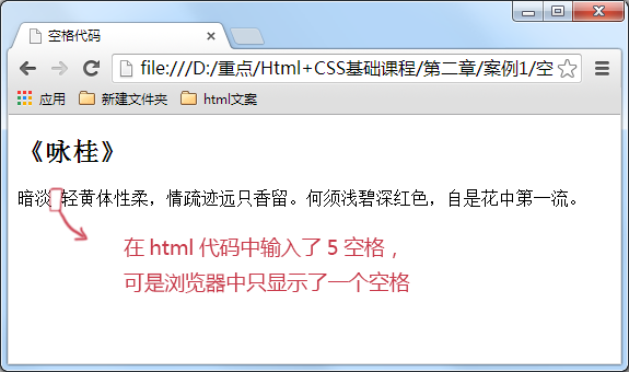 在上一节的例子,我们已经讲解过在html代码中输入空格、回车都是没有作用的。要想输入空格,必须写入 。