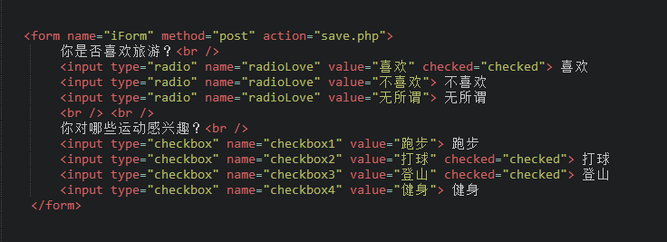 <input type="radio/checkbox" value="值" name="名称" checked="checked"/>