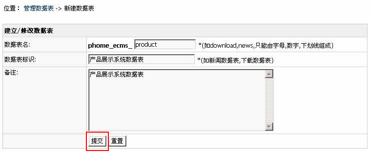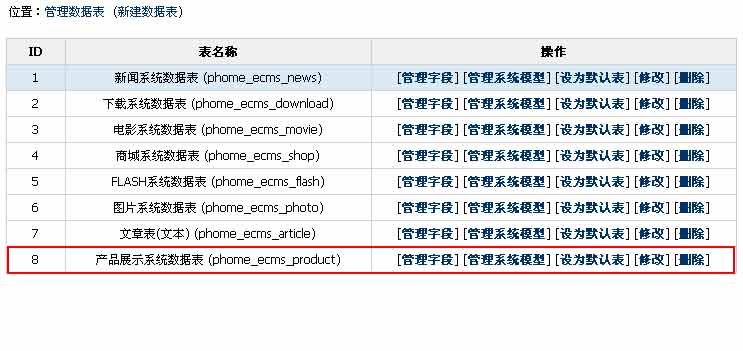 | 新建数据表后,管理数据表会显示刚增加的“产品展示系统表”: | ||||||||||||||||||||||||||||||||||||||||||||||||||||||||||||||||||||||