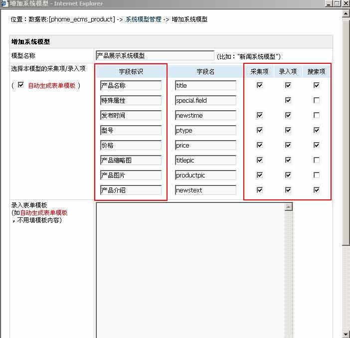 (三)、新建产品系统模型,也会有相应的产品采集表单,如下: |