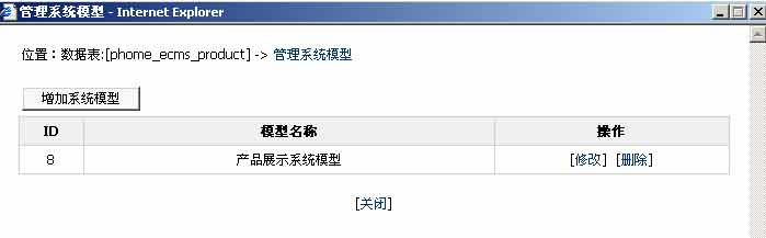 | 增加系统模型后,管理系统模型会显示刚才增加的“产品展示系统模型”: | ||||||||||||||||||||||||||||||||||||||||||||||||||||||||||||||||||||||