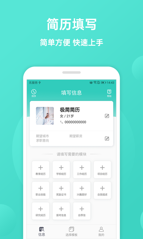 3、求职意向、工作经历、教育背景、兴趣爱好等均为必填选项,可直接添加。