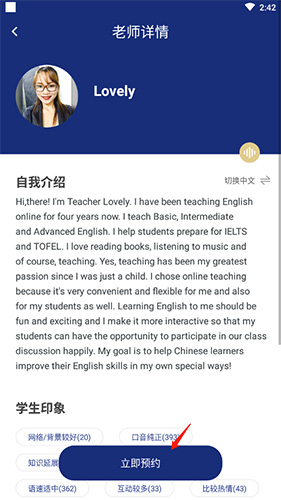 2.进入外教预约课页面,点击底部“立即预约”选项。