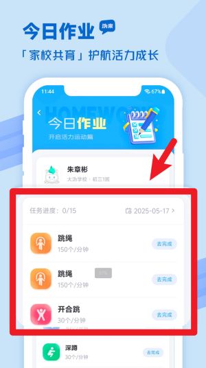 3、“今日作业”功能清晰展示跳绳、开合跳等任务进度,方便用户每天打卡,与家校协作完成训练目标。