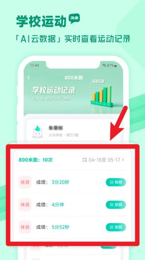 2.在“学校运动”页面,系统会根据AI云数据自动记录运动成绩,您可以随时查看不同日期的训练表现。
