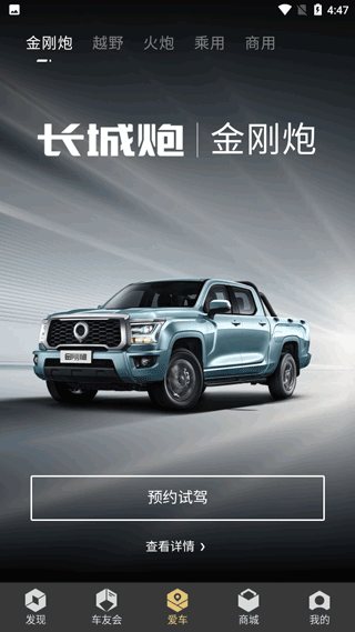 2.在汽车版块,您可以预约试驾各种长城炮版皮卡车型。
