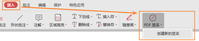 使用WPS Office打开PDF文件,依次点击“插入”--->“PDF签名”--->“创建新的签名”。