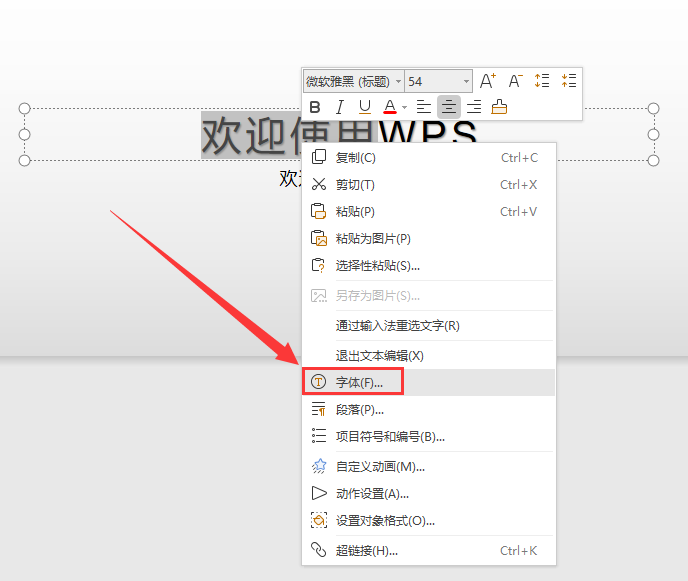 使用WPS Office打开文档,选中需要编辑的内容,鼠标右键点击“字体”。