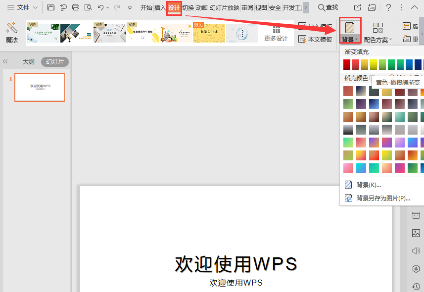 使用WPS Office打开文档,依次点击“设计”--->“背景”,直接选择其他颜色进行更换即可。
