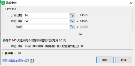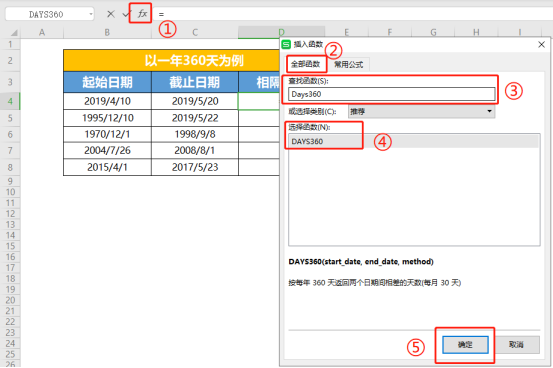 点击“插入函数”,在“全部函数”中查找并选择函数“DAYS360”,点击“确定”。