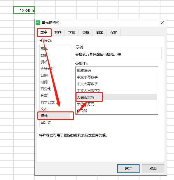 选择“数字”--->“特殊”--->“人民币大写”即可。