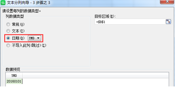 2、在步骤3的时候选择“日期”选择格式为“YMD”,点击完成。这样数据就快速变成日期格式了。
