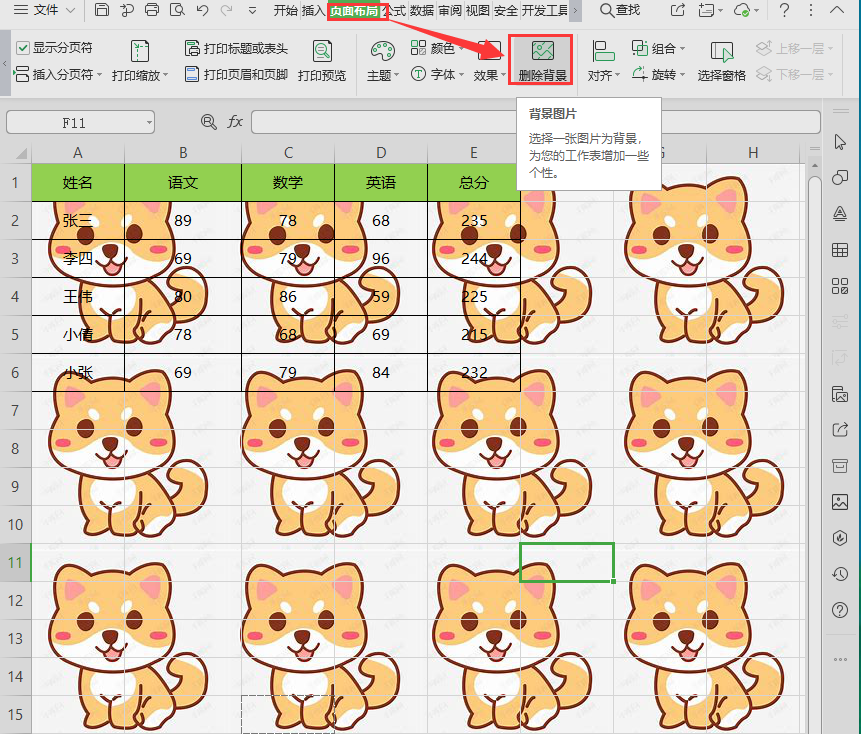 使用WPS Office打开表格,依次点击“页面布局”--->“删除背景”。