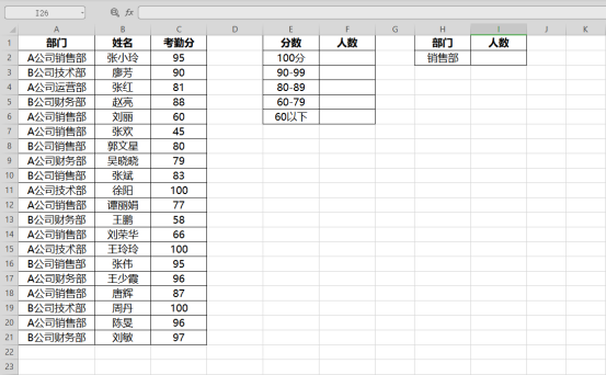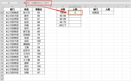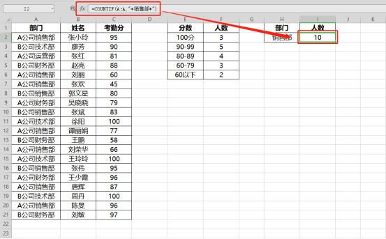可在I2单元格输入公式:=COUNTIF(A:A,"*销售部*")