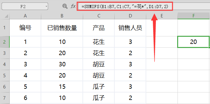 2、在F2单元格输入=SUMIFS(B1:B7,C1:C7,"=花*",D1:D7,2),结果显示“20”。