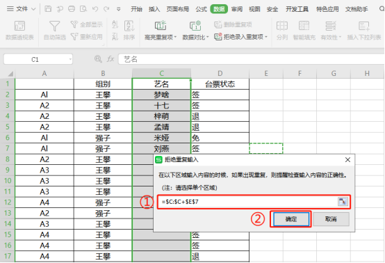在“拒接重复输入”的弹出框选择需要设置的单元格区域,点击“确定”。