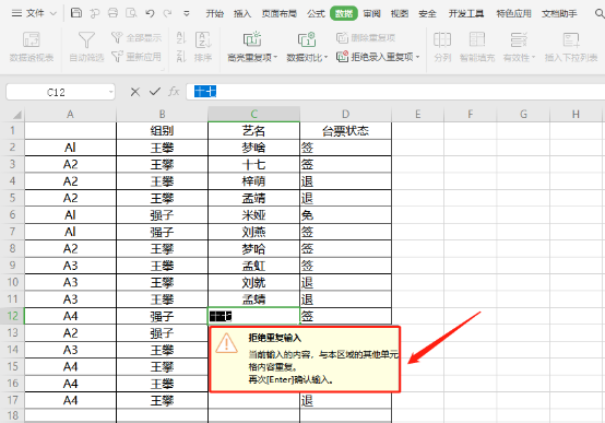设置完成后再次输入重复值,此时则无法输入重复项。