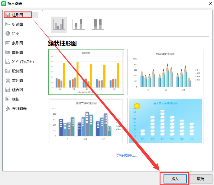2、在弹出框点击““柱形图”,选择一种样式后点击“插入”即可。