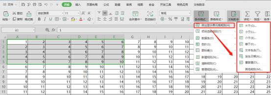 使用WPS Office打开表格,选中需要设置的单元格,依次点击“开始”--->“条件格式”。