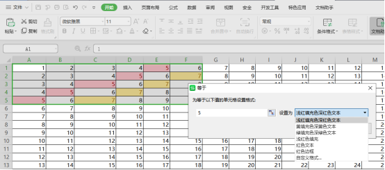 如选择“等于”,等于5显示浅红填充色深红色文本,等于7显示黄填充色深黄色文本,出现图示标识。