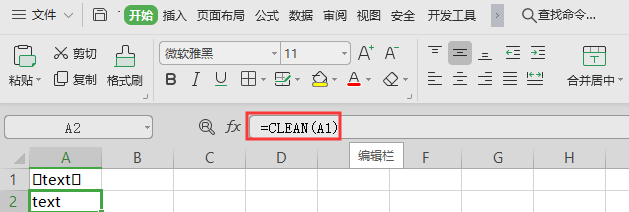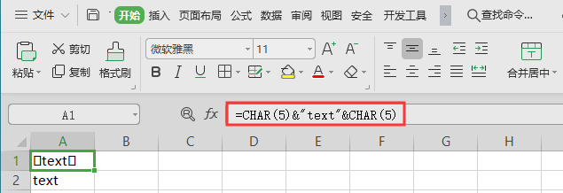 在A2单元格输入=CLEAN(A1),结果显示text,从上面字符串中删除不能打印的字符 CHAR(5)。