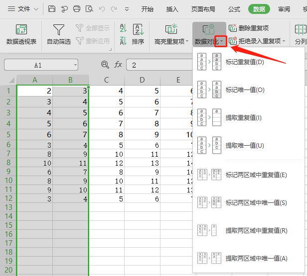 使用WPS Office打开表格,选中需要进行操作的列数,依次点击“数据”--->“数据对比”。