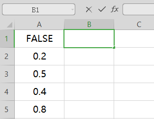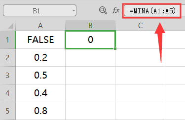 2、在B1单元格输入=MINA(A1:A5),结果显示“0”;表明最小值为FALSE,FALSE的值为0。