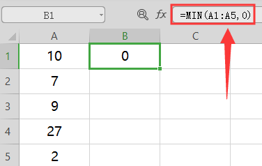 2、在B1单元格输入=MIN(A1:A5,0),结果显示“0”;表明表中的数值与0比较,最小值为0。