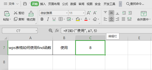 打开表格,在C7的单元格内输入=FIND(B7,A7,5),结果是8。