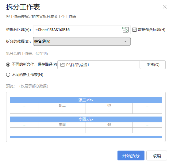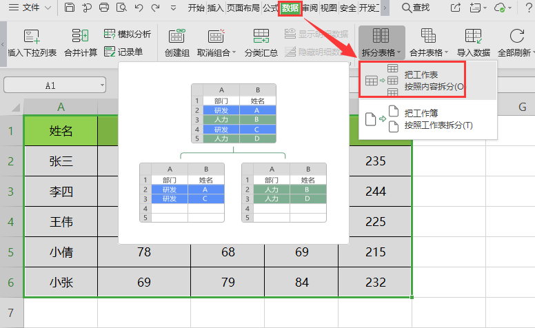 打开表格,选中需要调整的区域,依次点击“数据”--->“拆分表格”--->“把工作表 按照工作表拆分”。