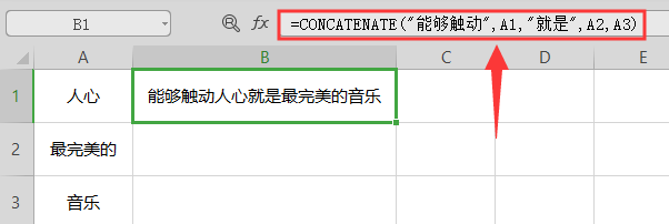 打开表格,在B1单元格输入=CONCATENATE("能够触动",A1,"就是",A2,A3)。
