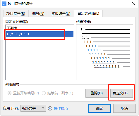 ?在「项目符号和编号」弹窗中,选择编号列表,点击「自定义」按钮。