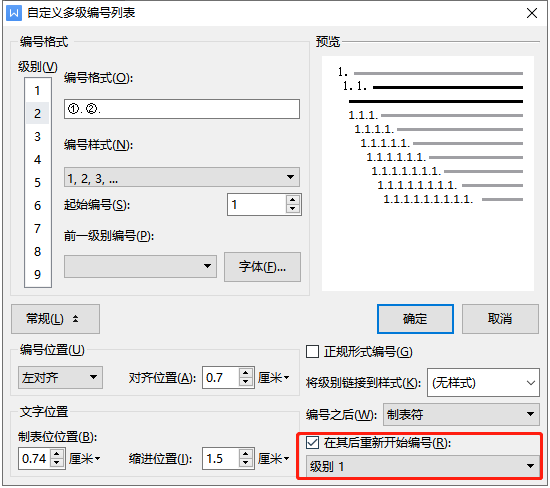 ?在「自定义编号」弹窗右下角处,勾选“在其后重新开始编号”,并设置为前一级别,如“级别1”。