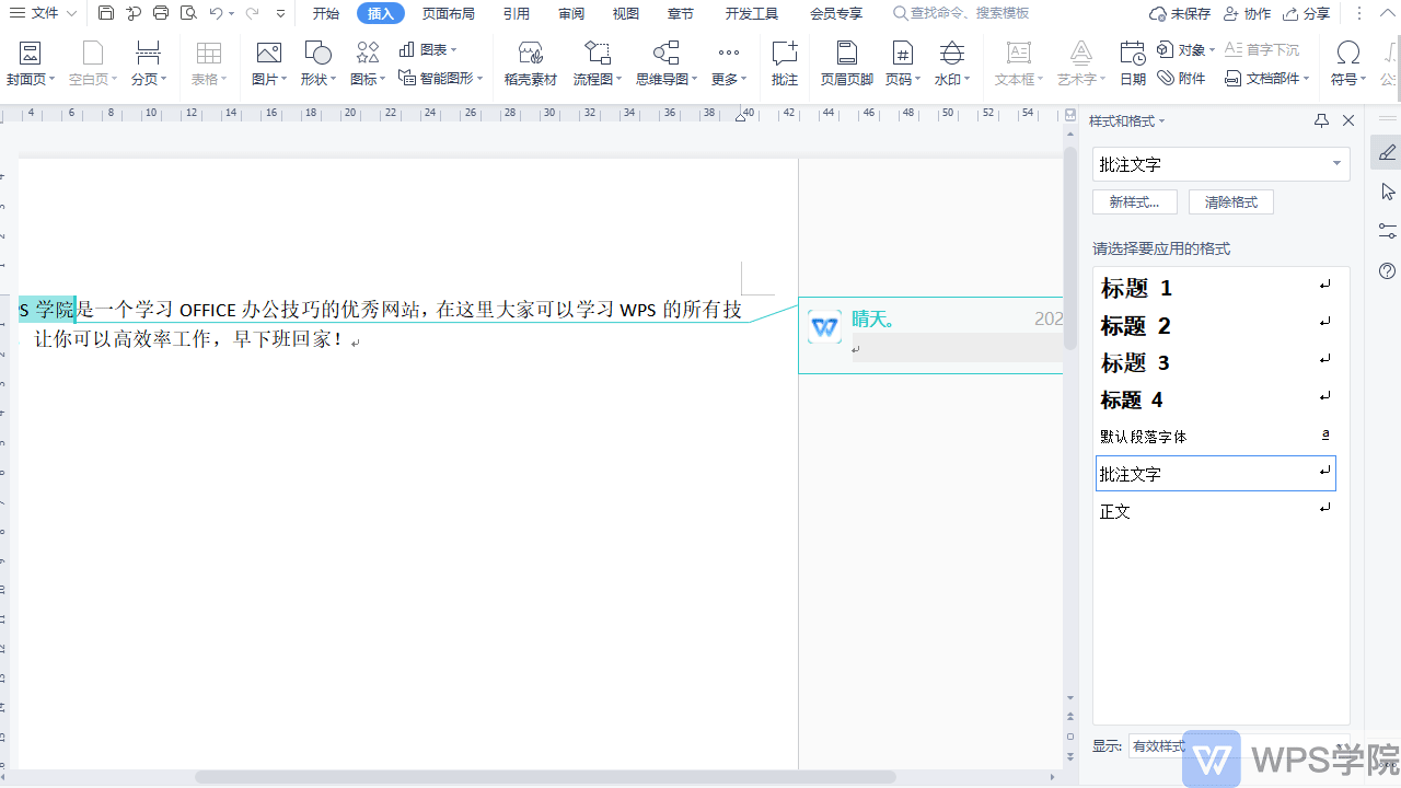 第二步:选中文字,点击「插入」选项卡下的「批注」按钮。