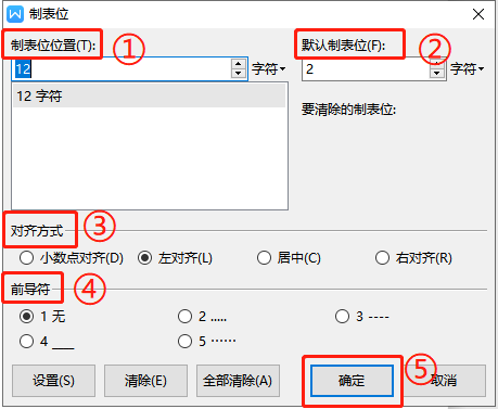 3、在弹出框,根据需要设置“制表位位置”、“默认制表位”、“对齐方式”、“前导符”等,点击“确定”。