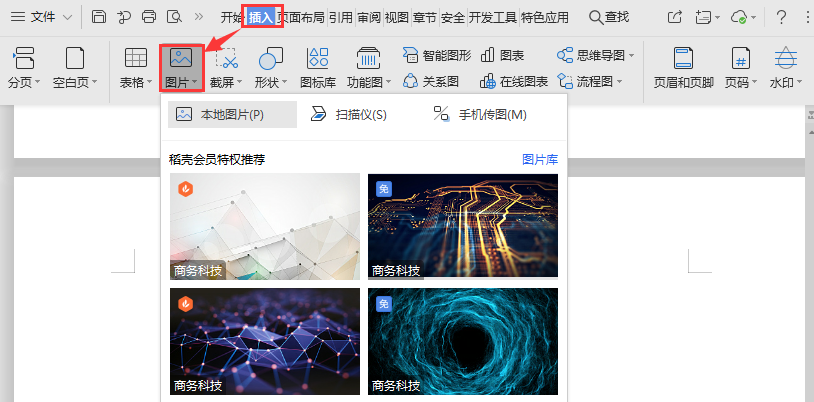 使用WPS Office打开文档,依次点击“插入”--->“图片”。