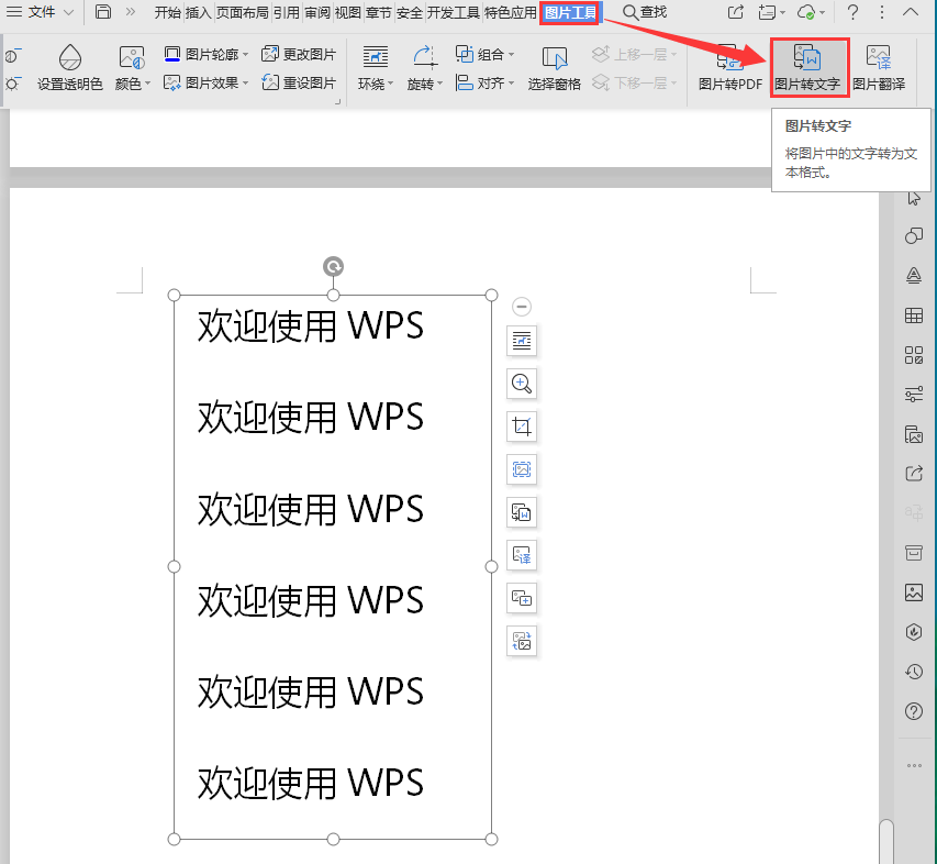 接着在“图片工具”选项卡中,点击“图片转文字”。
