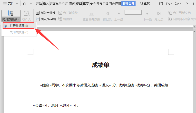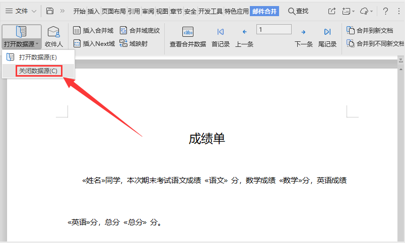 依次点击“邮件合并”--->“打开数据源”--->“关闭数据源”。