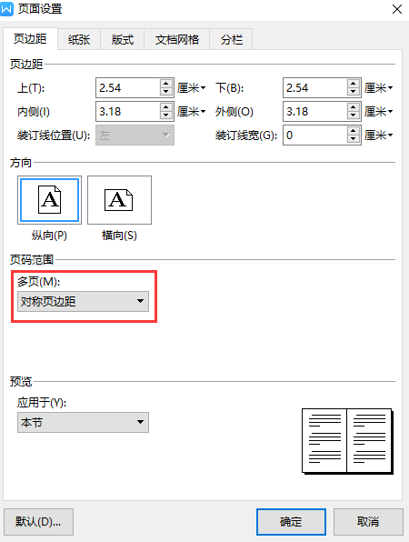 在弹出的“页面设置”的界面页码范围处选择“对称页边距”即可。
