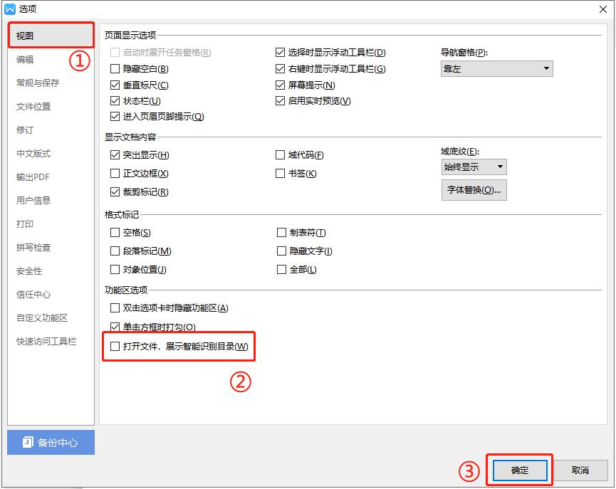 2、选择“视图”,取消勾选“打开文件,展示智能识别目录”,点击“确定”。