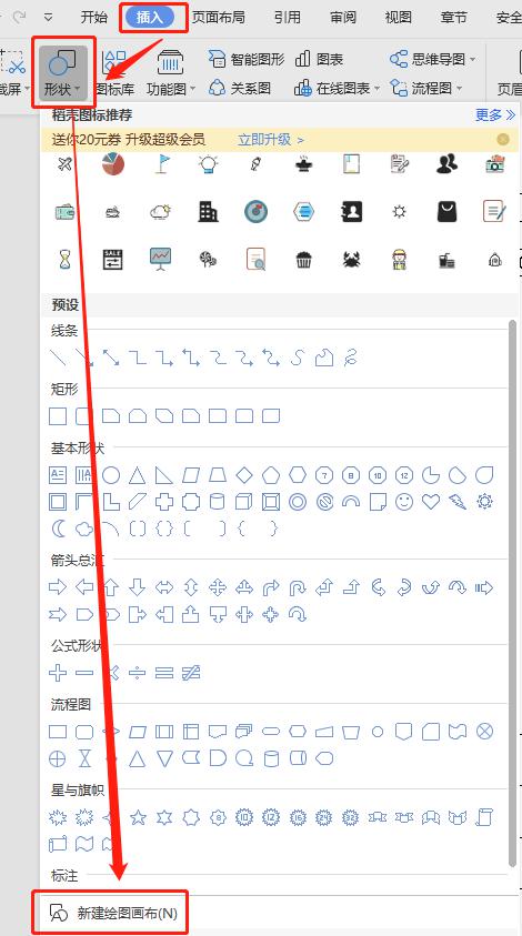 使用WPS Office打开文档,依次点击“插入”--->“形状”--->“新建绘图画布”。