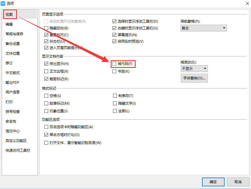 2、在弹出的“选项”界面点击“视图”,取消勾选“域代码”。