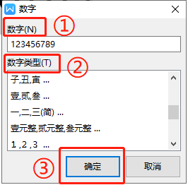 在“数字”的弹出框,根据需要输入数字,选择“数字类型”后点击“确定”即可。