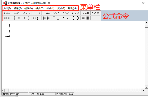 在“公式编辑器”中,最上面的是菜单栏,菜单栏下方是常用的一些公式命令。