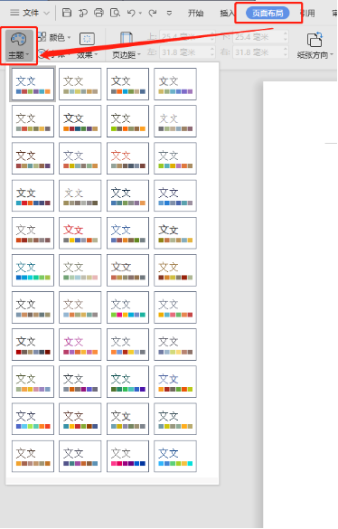 使用WPS Office打开文档,依次点击“页面布局”--->“主题”进行设置。