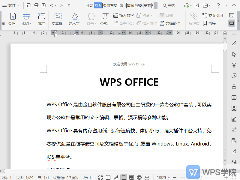 使用WPS Office打开文档,依次点击“插入”--->“页码”。