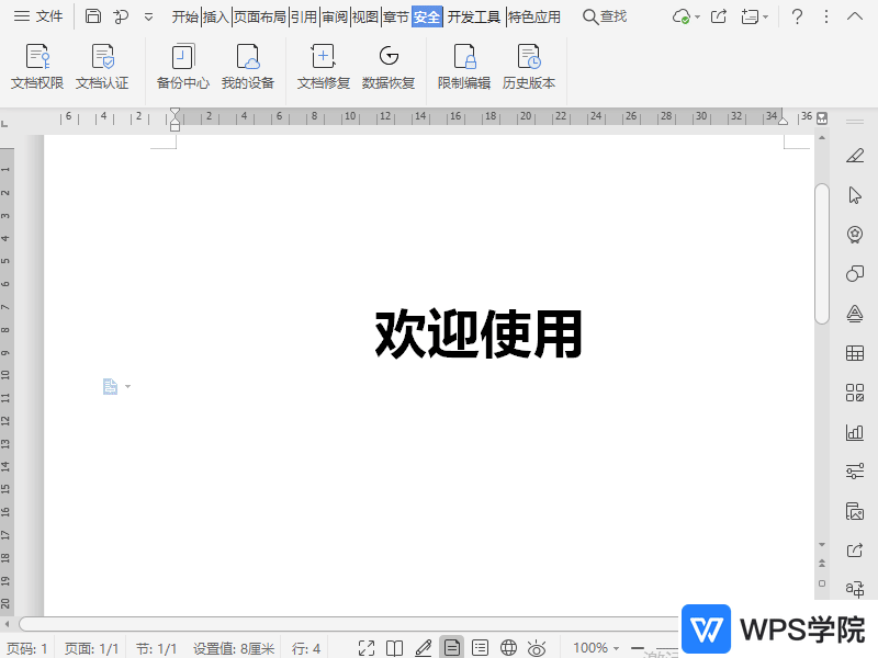 使用WPS Office打开文档,依次点击“安全”---> “文档认证”。