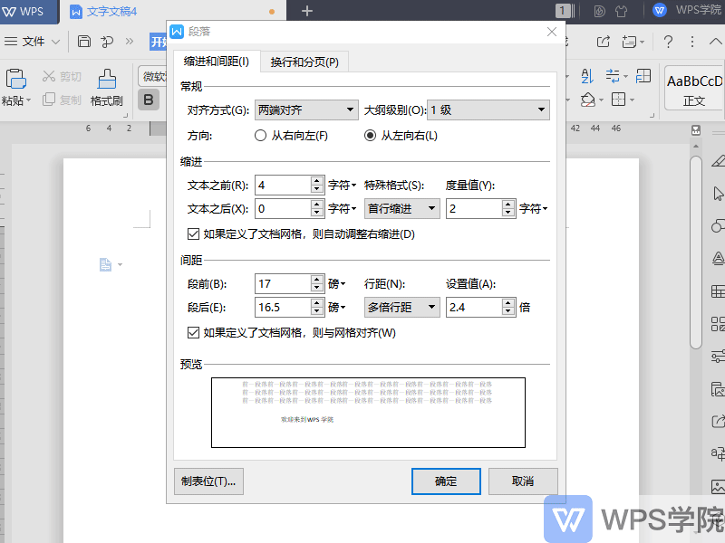 在弹出的段落属性框中,修改对齐方式、缩进设置和特殊格式即可。